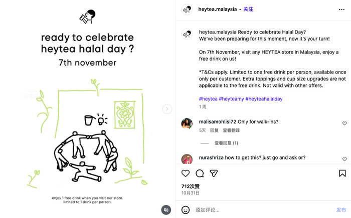 这种“尊重式沟通”让喜茶赢得了马来西亚年轻用户的好感。Instagram和TikTok等平台的评论中,“Finally Halal!”“It’s about time!”成为高频语句。信任的建立,不在于认证本身,而在于品牌如何讲这件事。