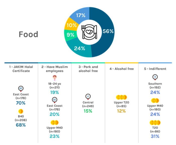 据Vodus数据显示,在清真认证方面,食品购买是受访者最为关注的因素,69%的受访者优先考虑清真认证以及商家是否聘用穆斯林员工。同样,64%的受访者在购买饮料时也会优先考虑这些因素。