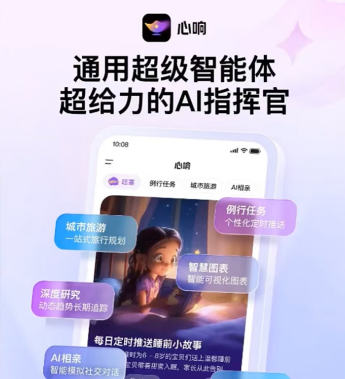 在应用场景上,心响App现已支持超200种任务类型,并在例行任务、城市旅游、AI 相亲、AI 绘本、摸鱼游戏、深度研究、法律咨询、健康咨询、智慧图表和试题讲解等10大场景中表现出色。未来计划扩展到10万+场景,满足更广泛的用户需求。