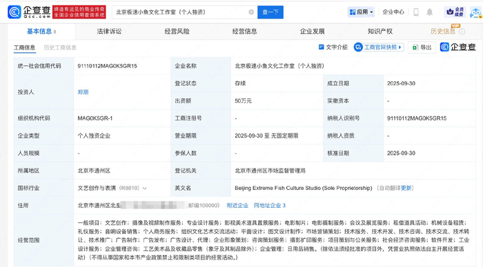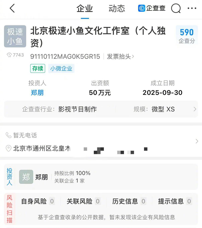 企查查APP显示,近日,北京极速小鱼文化工作室(个人独资)成立,郑朋(梓渝)担任投资人持股100%,出资额50万元,经营范围包含电影制片、电影摄制服务等。据悉,极速小鱼为艺人@我是梓渝_ 的昵称。