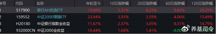 当然,对于无暇盯盘的小伙伴,还可以考虑对应的场外基金,银行AH优选ETF联接(A :016572,C:016573);中证2000增强(A:019918,C:019919),也可作为基准指数的Promax版本之选。