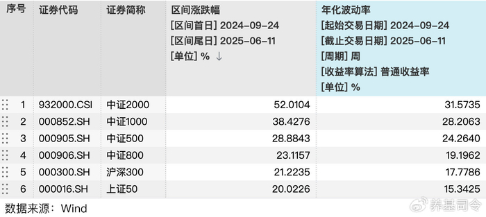 司令挑选了6只“大、中、小”市值风格的宽基指数!Wind统计显示,2024年9月24日-2025年6月11日区间,中证2000上涨52.01%表现最佳,年化波动率为31.57%弹性最大,其余涨幅和弹性排名依次是:中证1000、中证500、中证800、沪深300、上证50,小市值明显强于小市值风格。