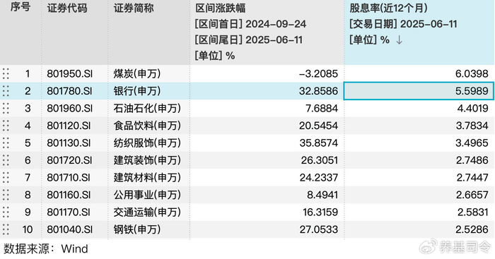 Wind统计显示,截至2025年6月11日,在31个申万一级行业指数中,近12个月股息率最高的是煤炭,其次是银行、石油石化、食品饮料。从2024年9月24日-2025年6月11日区间表现来看,纺织服装上涨35.86%最强,银行以32.86%涨幅紧随其后。