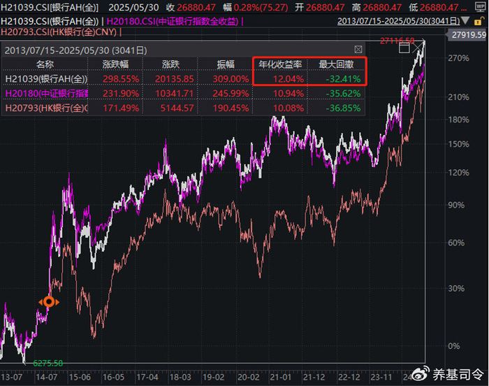 如下图,司令分别对比了成立以来,A股上市的中证银行、H股上市的HK银行,以及跨市场的银行AH指数,按照分红再投计算的全收益指数来看,银行AH年化超12%最大,最大回撤不到-33%最小,真正用策略实现了“涨多跌少”的神话!