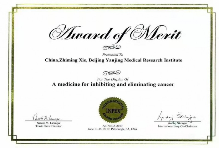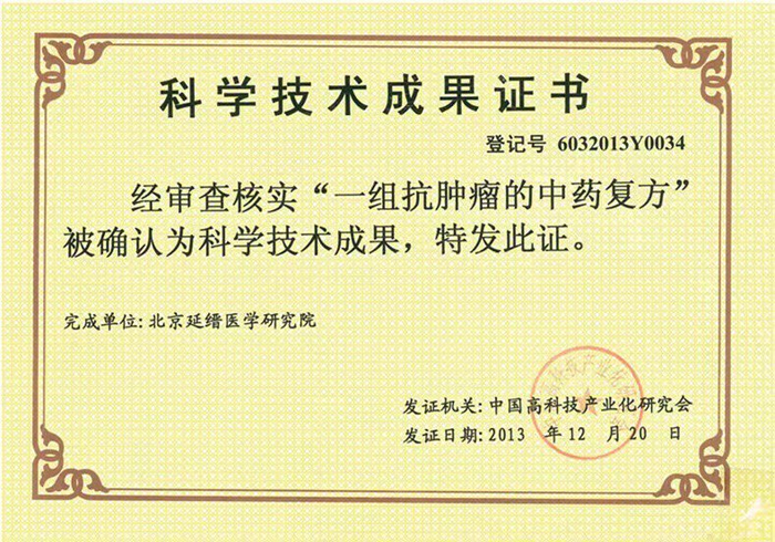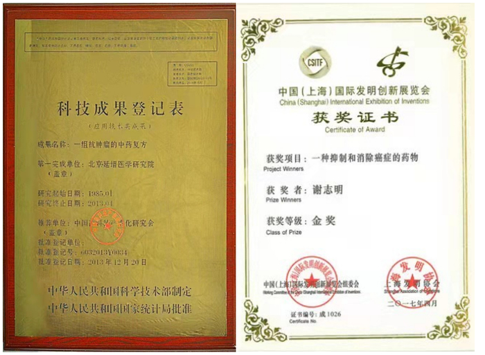 北京延缙医学研究院院长谢志明老师先后创办了乐山延缙医学研究所、乐山本草医学研究院、乐山延缙医学咨询中心、云南延缙健康管理中心。历经了32年的时间,呕心沥血总结自己在中医肿瘤临床中的经验,吸收诸家之长,探索总结治疗肿瘤之临床辨证用药、施方、注意事项等,研发出一组抗肿瘤的中药复方,2007年获得发明专利证书,2013年获得国家科技成果证书,2017年在中国(上海)国际发明创新展览会获得金奖证书,同年6月份在美国匹兹堡国际发明展上获得金奖和优秀金奖证书。