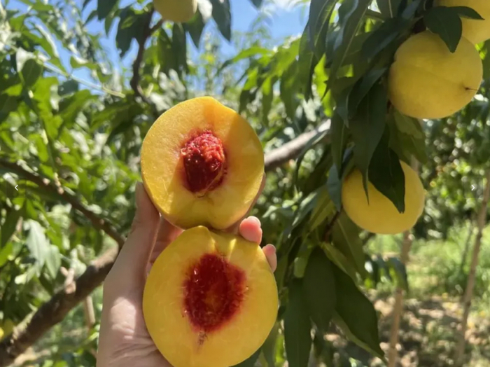 成熟的枣阳皇桃,果实饱满圆润,单果重量普遍在 250 克以上,部分优质果实可达500克。其表皮色泽艳丽,黄中透红,犹如天边的晚霞晕染在果实之上,光是外观就令人垂涎欲滴。轻轻咬上一口,皮薄肉厚的特质展露无遗,细嫩的果肉与充沛的汁水在口腔中迸发,酸甜比例恰到好处,既有蜜桃的清甜,又带着一丝独特的果香,口感层次丰富,让人回味无穷。其可溶性固形物含量高达 16%-18%,远远高于普通桃子品种,还含有多种维生素和人体必需的微量元素,深受消费者青睐。