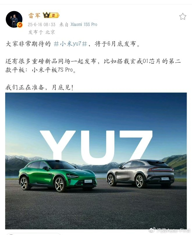 6月18日,小米创办人、董事长兼CEO雷军在微博发文称,小米YU7将于本月底发布,样车已陆续到店。且雷军此前还说,这款车预发布之后,用户的留资量是小米SU7的三倍。