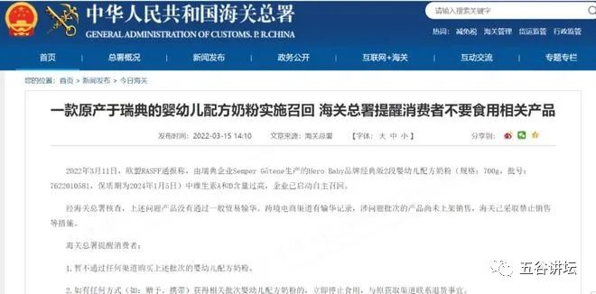 3月15日,海关总署官方发布,3月11日,欧盟RASFF通报称,由瑞典企业Semper Götene生产的Hero Baby品牌经典版2段婴幼儿配方奶粉(规格:700g,批号:7622010581,保质期为2024年1月5日)中维生素A和D含量过高,企业已启动自主召回。