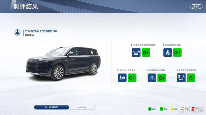 在日前中保研公布的2025第二批碰撞测试车型中,腾势N9在全部五项测试中均获得最高评级,成为本批次实现全优“大满贯”成绩的新能源车型。