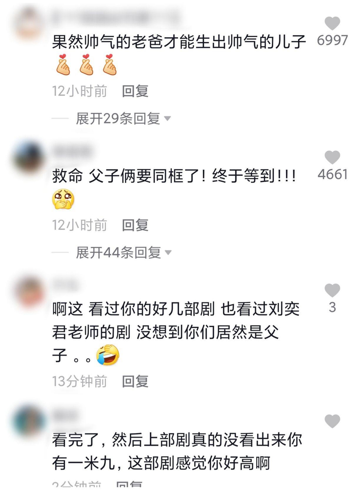 看了刘怡潼和刘奕君,的互动,有人说帅气的老爸可以生下帅气的儿子,终于等到了父子同框。还有人说以前看过刘怡潼的作品,但没想到他和刘奕君是父子。