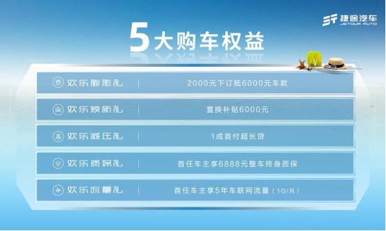 为感恩用户对捷途汽车的支持与信赖,2024款捷途X90 PLUS上市期间,还为用户提供5重购车礼遇:购车即享订金2000元抵6000元的“欢乐膨胀礼”,置换补贴6000元的“欢乐焕新礼”;1成首付超长贷,为提车“欢乐减压”;首任车主享6888元整车终身质保、5年车联网流量(1G/月),为用户送上诚意满满的“欢乐质保礼”、“欢乐流量礼”。