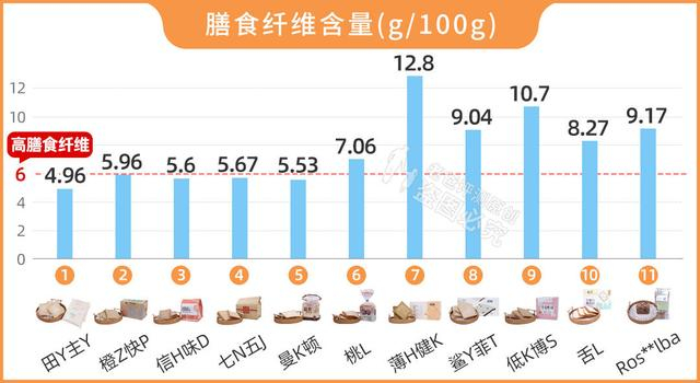 根据检测结果,有6款面包的膳食纤维含量超过了6g/100g。剩下几款膳食纤维含量四舍五入也比较接近6g/100g,也还不错。