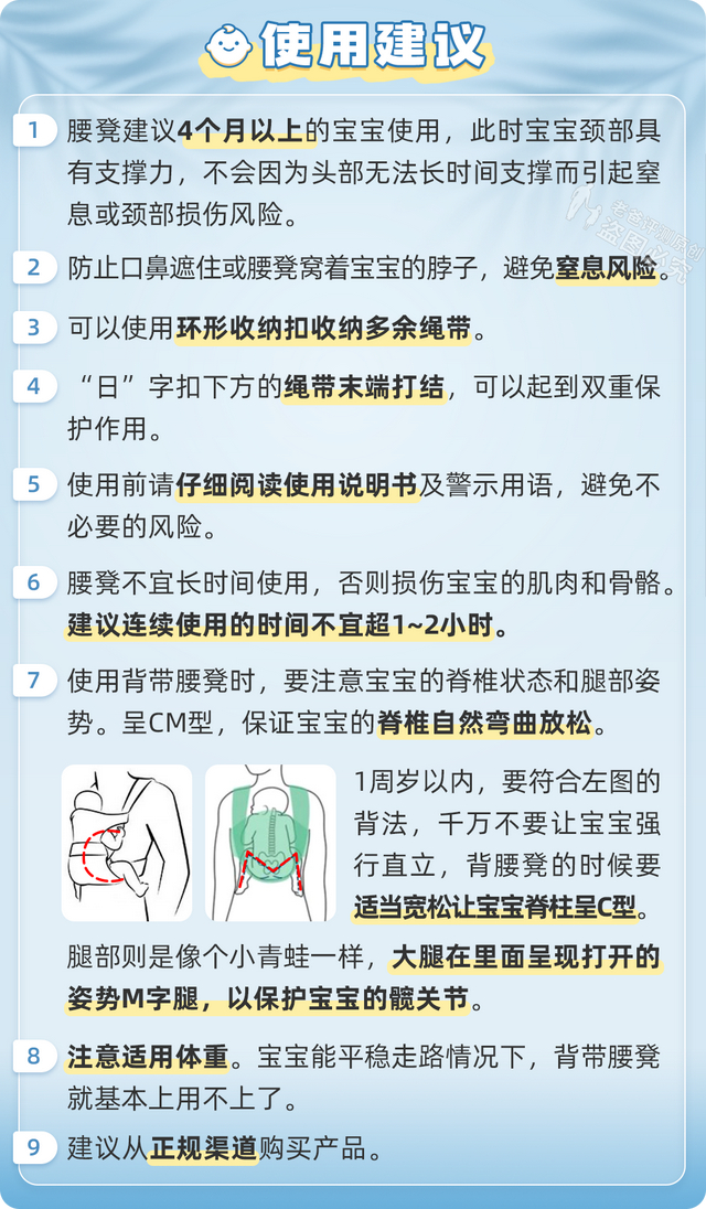 此外,我们还总结了腰凳的重点使用建议,什么样的孩子不能用腰凳,以及腰凳使用的注意事项: