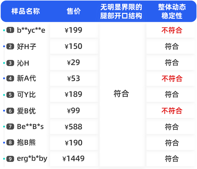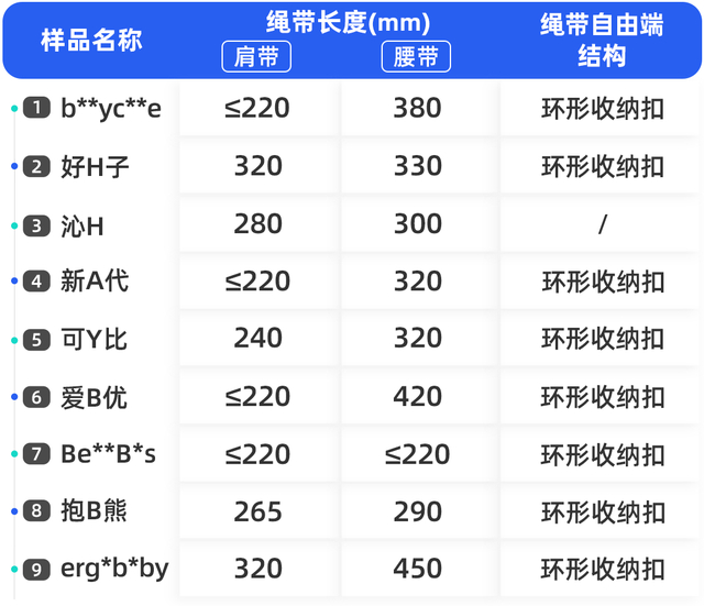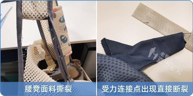 这三款腰凳均出现不同程度的肩带滑移,其中 4 号、6 号在测试时还出现腰凳面料撕裂,以及受力连接点出现直接断裂的情况。