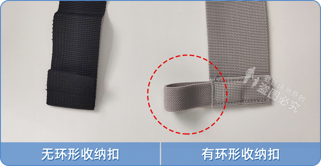 本次样品中,有八款腰凳都有设计绳带的环形收纳扣,但我们随机问了好几位有娃的同事,他们都不太了解这个环形收纳扣到底是干什么的。这些腰凳的说明书里、警示标语、或者电商详情页面里,也没有提及它的使用方法。