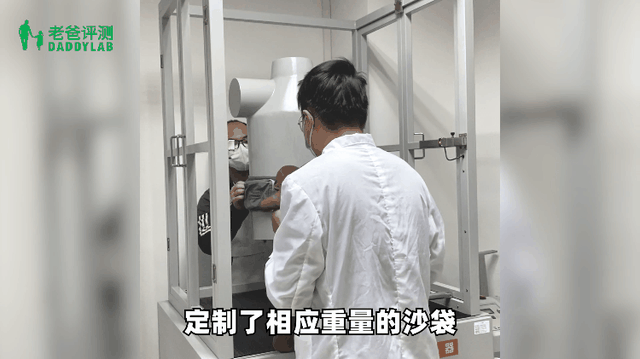 我们将腰凳安装在一个模拟成人的测试躯干上,并放入 15kg(或产品宣称最大载荷)标准沙袋作为婴幼儿模型,然后让测试躯干在垂直方向上下振动以模拟人正常步行。