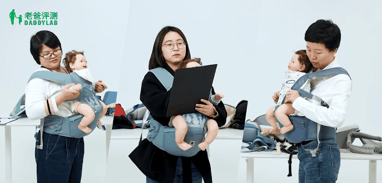 此外,我们还进行了真人试穿体验,我们找了三位宝妈、一位宝爸和一位从来没用过腰凳的女生去试穿,测试看一个人带娃的时候能不能完成独立穿脱。