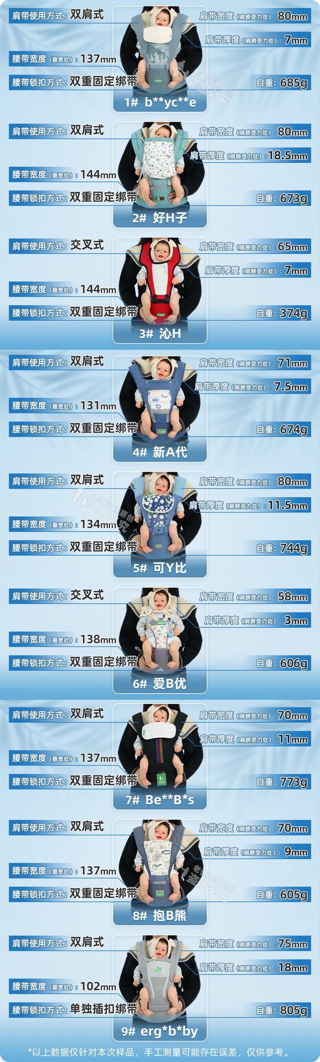 我们选取了影响腰凳使用舒适性的腰凳自重、腰带宽度、腰带锁扣设计、肩带宽度、肩带厚度、肩带使用方式 6 个指标进行比较。