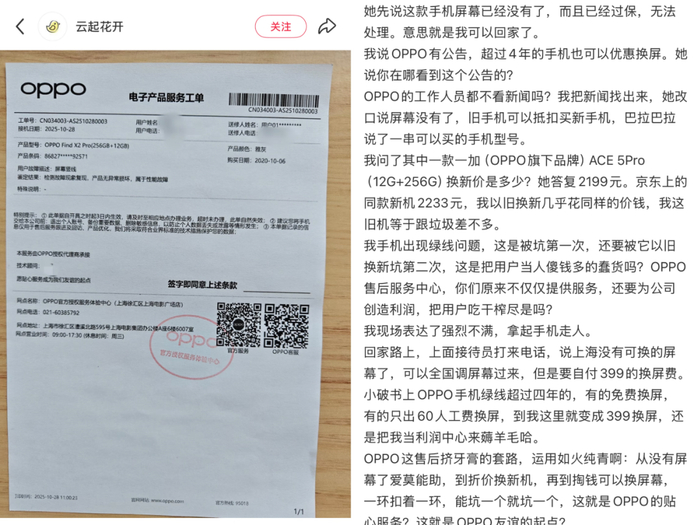 OPPO曾公开承诺,购机4年内免费换屏,4年后可享受优惠换屏。但用户“子文想去大理看海”发帖称,其为母亲购买的OPPO手机出现绿线,“无拆无修且使用未满4年”,前往售后网点时却被要求支付499元换屏费,理由是无法提供充电头或发票。