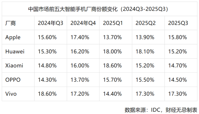 2024年苹果出货量下滑900万台,2025年一、二季度中国市场份额始终徘徊在第五位,这被视为国产手机品牌的突围窗口期,华为、小米、vivo、OPPO均试图抓住这一机遇。