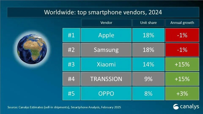 Canalys数据显示(2024年),OPPO品牌全球市场份额较上一年下降一位,跌至第五,距离非头部阵营仅一步之遥。
