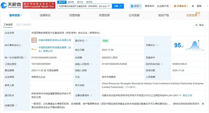 天眼查工商信息显示,近日,华润双鹤生物医药产业基金投资(呼和浩特)合伙企业(有限合伙)成立,执行事务合伙人为华润医药股权投资基金管理(汕头)有限公司、汉威华酉股权投资汕头有限公司,出资额5亿人民币,经营范围包括以私募基金从事股权投资、投资管理、资产管理等活动。合伙人信息显示,该基金由内蒙古金丰投资管理有限公司、内蒙古冠世投资集团有限公司、华润双鹤(600062)等共同出资。