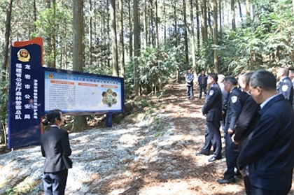 福建省森警总队一行在上杭白砂国有林场调研。龙岩市林业局供图揭牌仪式后,福建省森警总队一行深入上杭白砂国有林场调研森林警察林、涉案珍稀植物迁地保护基地建设等。