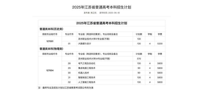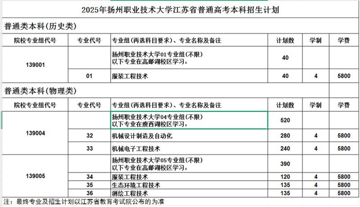 扬州职业技术大学今年首批设置机械设计制造及自动化、机械电子工程技术、服装工程技术、生态环境工程技术、测绘工程技术等5个职业本科专业,共招生950人,全部面向江苏省内。其中,910个招生计划面向物理类考生,40个招生计划面向历史类考生。
