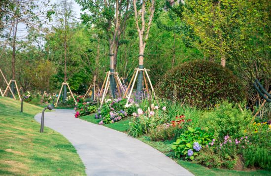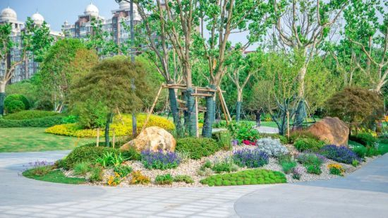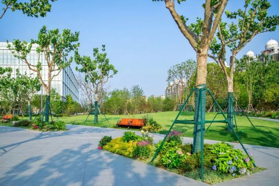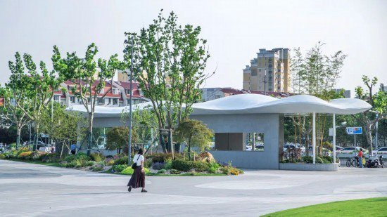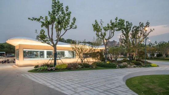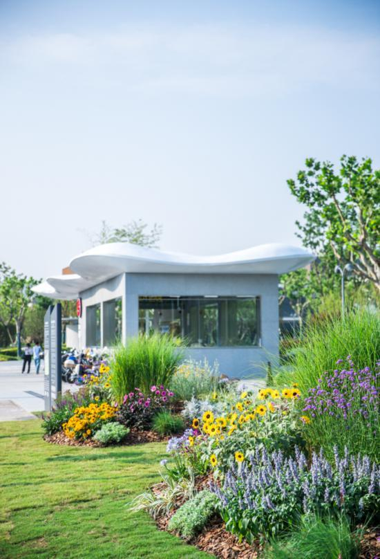 设计溯源浦东历史,提取江海文化,融入建筑的现代艺术氛围,打造海纳百川、兼容并蓄的形象展示窗口和城市客厅。利用原有广场上的梧桐,成为环抱的姿态,勾勒广场的形态,将人们从地铁站、城市道路快速引导至浦东城市规划和公共艺术馆。周边起伏的地形呼应云朵车站的建筑顶盖,在蓝天白云下格外飘逸和灵动。道路与草坪边界种植着丰富的宿根花境,展现精致的园艺配植效果。