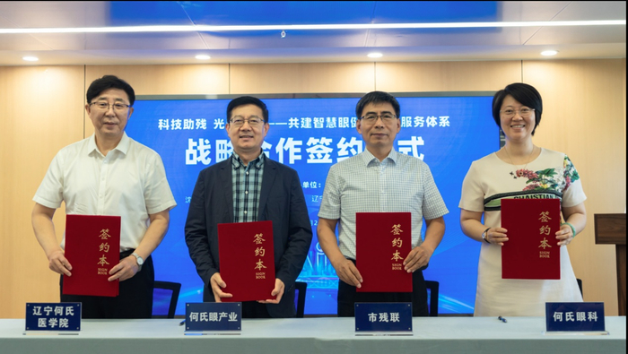 6月20日,沈阳市残联与何氏眼科集团、辽宁何氏医学院、何氏眼产业集团共建智慧眼健康公益服务体系战略合作签约仪式在沈阳何氏眼科医院举行,四方携手通过深度融合科技、医疗、教育与产业资源,为残疾人群体提供更精准、高效、温暖的全链条服务,标志着沈阳市在科技赋能残疾人事业、特别是眼健康服务领域迈出坚实一步。沈阳市残联党组成员、副理事长何长江,何氏眼产业集团常务副总经理赵国华、何氏眼科集团副总经理徐玲、辽宁何氏医学院执行校长丁维光代表四方签署战略合作协议。