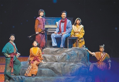 “从延安出发——纪念中国人民抗日战争暨世界反法西斯战争胜利80周年戏剧晚会”剧照。 吴 晨摄“大人们去打仗,就是为了让你们——可以有别的选择。”舞台上,冼星海对延安鲁迅艺术学院里学唱歌谣的小战士们坚定诉说。转眼,舞台背景,黄河滔滔,舞台上方,红旗飘飘,灯光将整个剧场染成一片金色。“保卫家乡!保卫黄河!保卫全中国!”延安歌舞剧团的演员们齐声高歌,台下观众激扬合唱。