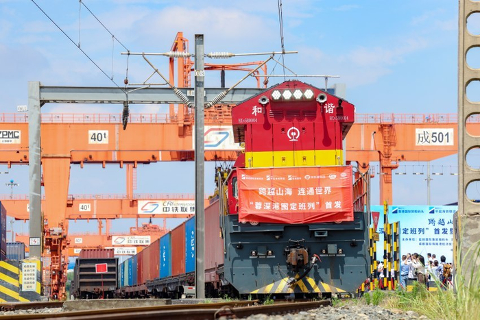 5月28日上午,首趟满载电子配件、电视机配件等货物的“蓉深港图定班列”从位于铁路港鸣笛启程。成都国际铁路港经开区管委会供图