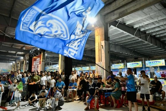 在海安大生·鑫天地设立的大型观赛点,老厂房的钢铁骨架被巨型LED屏幕的荧光点亮。作为南通34个“第二现场”之一,这座由纺织厂房蜕变而来的文化地标,正以“足球+文旅”的创新配方,为城市更新注入澎湃动能。“还是第一次在厂房里看球赛,每当踢到关键点,挑高空间让声浪层层激荡,氛围非常好,给我们球迷带来了别样的沉浸感。”通海蓝魂球迷会球迷蒋根早早赶到现场抢占了“最佳观赛区”,和朋友相约一起吃龙虾、喝啤酒、看球赛。