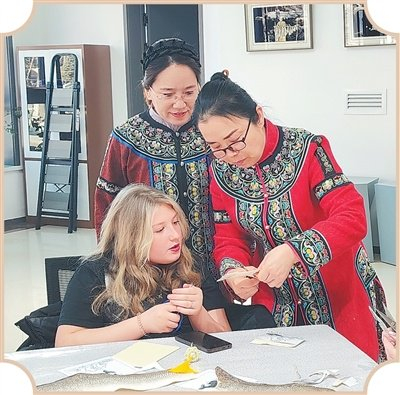 尤雪松(右一)向俄罗斯游客教授鱼皮画制作。 石 乔摄