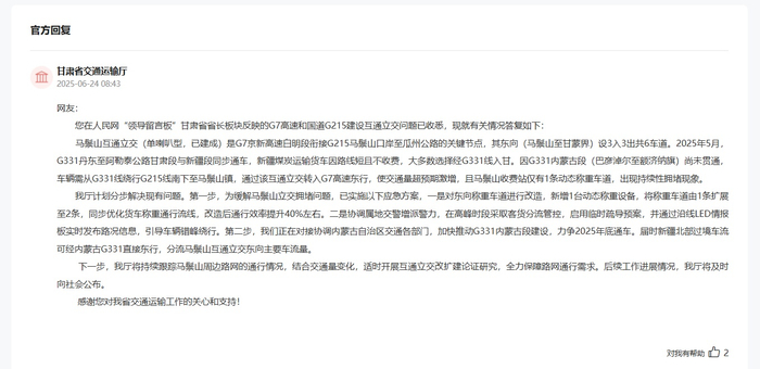 官方回复截图收到留言后,甘肃省交通运输厅积极回应:马鬃山互通立交(单喇叭形,已建成)是G7京新高速白明段衔接G215马鬃山口岸至瓜州公路的关键节点,其东向(马鬃山至甘蒙界)设3入3出共6车道。2025年5月,G331丹东至阿勒泰公路甘肃段与新疆段同步通车,新疆煤炭运输货车因路线短且不收费,大多数选择经G331线入甘。因G331内蒙古段(巴彦淖尔至额济纳旗)尚未贯通,车辆需从G331线绕行G215线南下至马鬃山镇,通过该互通立交转入G7高速东行,使交通量超预期激增,且马鬃山收费站仅有1条动态称重车道,出现持续性拥堵现象。