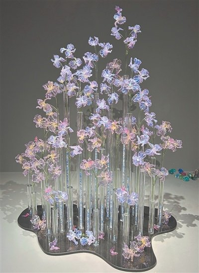 结合传统琉璃工艺与现代艺术创作的《邂逅鸢尾》,作者刘媛。 赵 冉供图夏日的中国国家博物馆游人如织,“明星文物”明孝端皇后九龙九凤冠前更是人潮涌动。与之相呼应,该馆“琉光璃彩——淄博琉璃艺术展”上,一件琉璃制成的凤冠同样引发关注。历经千年的琉璃艺术,正以新的形式折射出万般光彩。