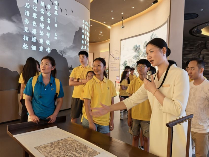 夏令营走进安岳石窟数字展示中心。张英摄最让孩子们兴奋的,是安岳石窟数字展示中心的“穿越时刻”。走进这里,仿佛瞬间穿越时空隧道,以往只能远观的精美石窟造像,如今“走”出崖壁,以超高清、3D立体的形态呈现在眼前。数字展示中心运用前沿的VR、AR、全息投影等技术,将安岳石窟的绝美细节“放大”到极致,能清晰看到佛像上的每一处褶皱、面部表情。孩子们纷纷感叹古代工匠的鬼斧神工,沉浸式感受石窟文化的魅力。