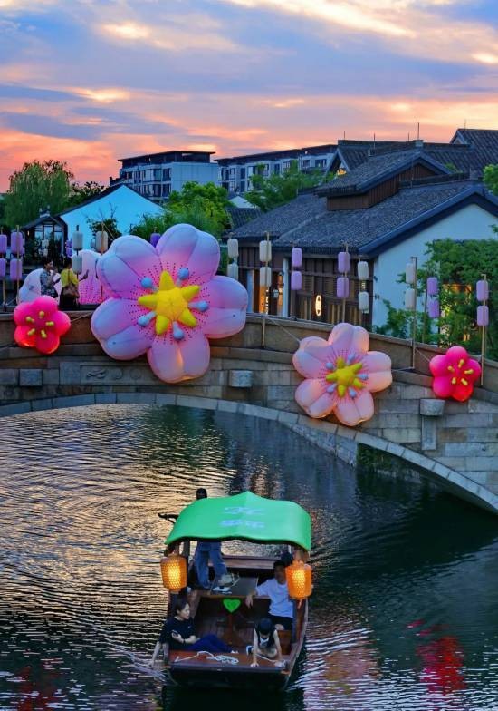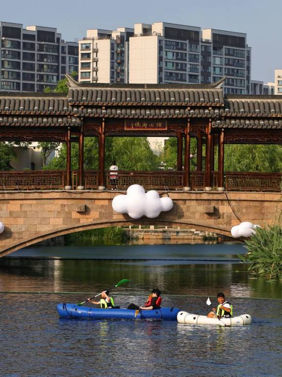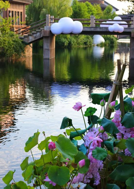充满了“夏日梦游”气息的水岸,点缀着发光的云朵,香花桥、水曲桥、烟雨廊桥、映月桥以及游船,古韵中带着稍许俏皮,不仅好玩,也很好看。