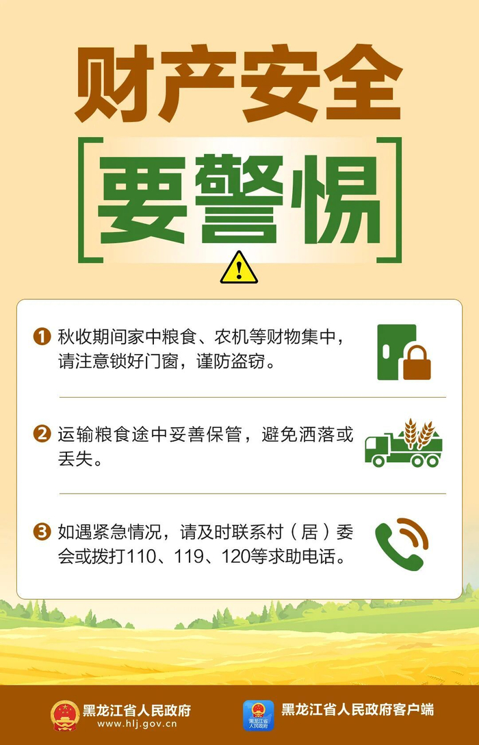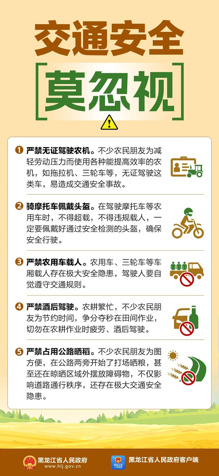 眼下正是秋收农忙时节,农村生产活动和货物运输繁忙,各类安全风险交织叠加。秋收虽忙,安全要防,这份秋收安全提示请查收,一起为丰收画卷添上“安全”底色。