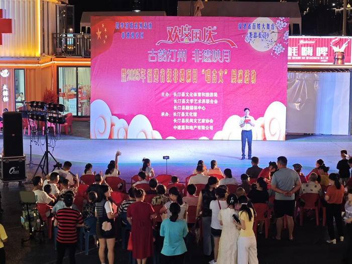 长汀县梅林夜市航拍夜景。中建海峡供图国庆、中秋“双节”期间,为丰富市民文化生活,展现汀州非物质文化遗产的独特魅力,梅林夜市项目推出“古韵汀州 非遗映月”暨省级非遗项目“唱古文”展演活动。期间,传统舞蹈、客家山歌、客家古文等非遗表演在此轮番上演,让传统文化在烟火气中焕发新光彩,为这座古城营造了浓厚的文化氛围。
