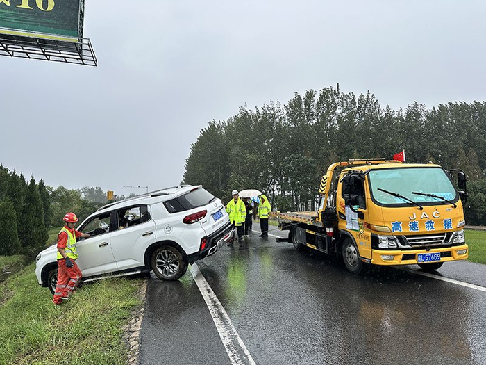 正在附近巡查的服务区工作人员闻声赶来,不顾裤脚溅湿查看车辆陷困情况,协助车主联系高速免费救援,及时布设警示区域,引导过往车辆减速绕行。拖车抵达后,服务区工作人员协助固定牵引绳、调整拖车角度,最终合力将车拉出。