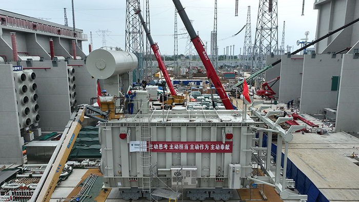 合州换流站工程核心设备换流变安装。夏兵 摄以合州换流站工程为例,10月6日,1200余名特高压建设者、90余台各类机械设备,来回穿梭于合州换流站工程现场,高效开展双极低端换流变、极I低端换流阀、500千伏GIS设备和直流设备安装,同步进行建筑物装饰装修、暖通、消防施工、二次屏柜组立、全站电缆敷设等工作,全面保障工程加速推进。