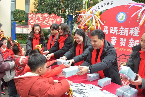 校领导与教师们为学生送上新年小礼物。校方供图本次活动根据学生年龄特点与认知规律,设计了四大体验板块,让教育在活动中自然发生。活动前夕,各班级已开展“元旦溯源”“马年话俗”主题课堂,教师通过故事、歌谣等形式,帮助学生在趣味中理解传统节日的文化内涵,增强对中华优秀传统文化的认同与自信。