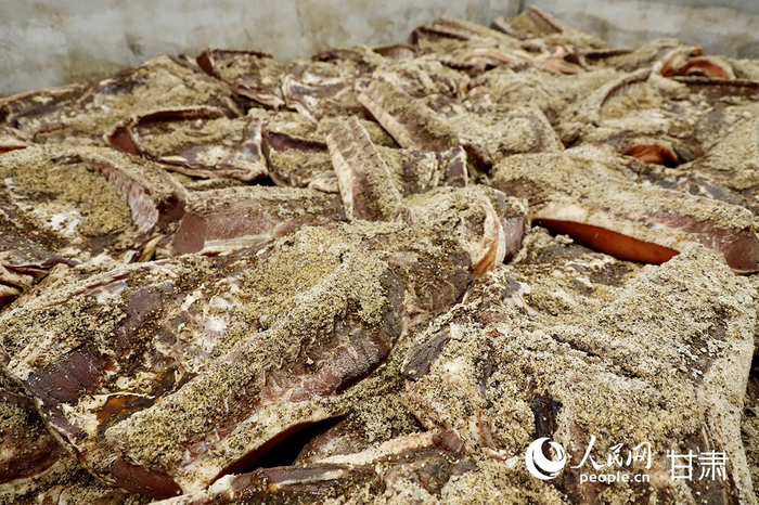 腌制中的陇西腊肉表面密布岩盐、花椒、小茴香等十多种特色香料。人民网记者 焦隆摄