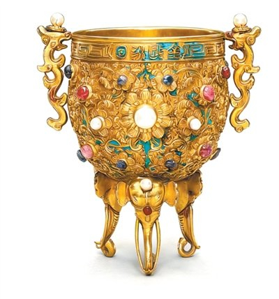 在故宫博物院“百年守护”大展展出的乾隆款金嵌珠石金瓯永固杯。 故宫博物院供图