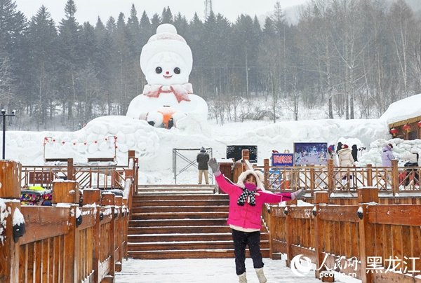 作为雪乡冬季文旅矩阵的核心亮点之一,这座大雪人延续了经典的林区小女孩形象,将东北民俗与冰雪雕刻艺术精妙融合。雪人头顶戴着一顶缀满毛绒雪花装饰的东北大花帽,脖颈间围着厚实的红色围巾,在皑皑白雪的映衬下显得格外醒目。手捧着红彤彤的冻柿子,寓意着新的一年“事事如意”,与雪乡银装素裹的冬日景观相映成趣。