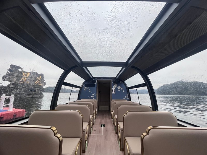 在松林坡码头看到,3艘崭新的电动船舶整装待发。船舶通体设计极具科技感,大面积全景天窗贯穿船体,成为亮眼吸睛的视觉焦点。步入船舱,座椅沿两侧整齐排列,游客靠窗而坐,碧波荡漾的湖面风光可尽收眼底,沉浸式游湖体验拉满。