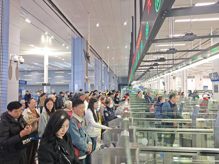 1月4日,港珠澳大桥珠海公路口岸迎来出境高峰。田佳琪摄“新年好,请大家按顺序准备好通行证!”8时许,港珠澳大桥珠海公路口岸迎来了第一波通关高峰。来自福建的游客李女士颇为激动:“没想到走港珠澳大桥这么方便,几分钟就能通关!”