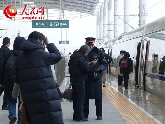 1月4日,银川火车站工作人员正在帮助旅客核对乘车信息。人民网记者 梁宏鑫摄保铁路畅通,就是保经济畅通;保群众出行,责任重大。刚刚过去的元旦假期,银川火车站及管内各高铁站预计发送旅客17.19万人,日均3.44万人。1月4日上午,记者在银川站看到,车站内,中转换乘、快速通道等引导标识清晰醒目,工作人员穿梭在人群中提供咨询引导服务;车站外,工作人员顶着寒风不间断作业,虽然连日降雪,但铁轨、站台边缘无一丝积雪。
