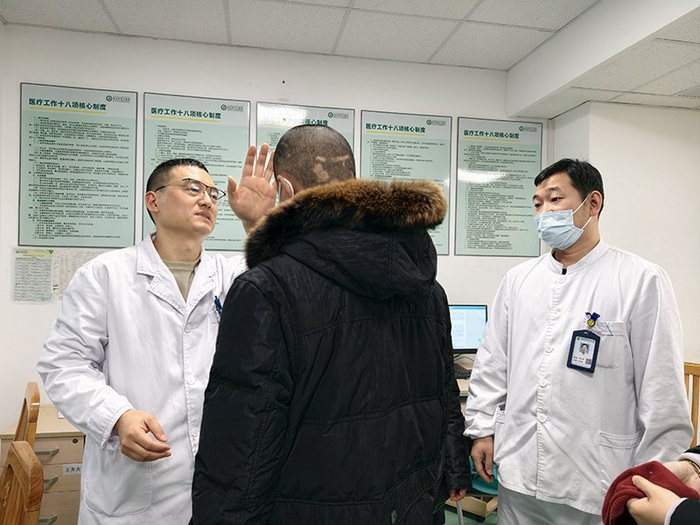 近日患者来院复查时,神经外科医护人员查看患者的恢复情况。